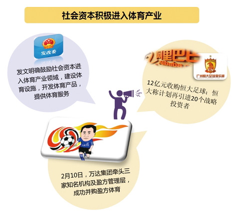 2月10日,万达集团牵头三家知名机构及盈方管理层,成功并购盈方体育传媒集团100%的股权,其中万达集团控股68.2%,成为国内体育产业界的大事。王健林表示,此次并购有助于加快实现中国申办世界杯的目标。对此,全国政协委员、原国家体育总局装备器材中心主任马继龙认为,这预示着体育产业前景被资本看好。