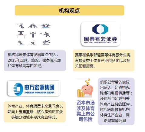 2015年,作为体育产业改革和发展的关键之年,足球、路跑、健身俱乐部和体育触网这四个领域将成为整个体育产业发展的重点,多只公募基金实际在去年四季度就纷纷布局。国泰君安发布报告认为,改革图强下的体育主题符合自上而下推动明确、行业空间大、政策密集的强主题特征。赛事和俱乐部运营等体育服务业将直接受益于体育产业市场化以及相关配套措施。申银万国则认为,体育产业、体育消费未来景气度长期向上毋庸置疑,核心是如何在众多细分领域中寻找商业模式。