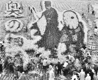 日本农民正在收割稻子,形成有趣图案。 本报记者 闫海防摄