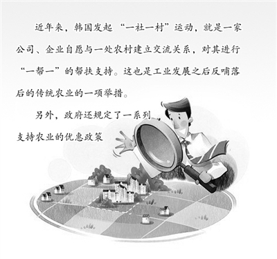 近年来,韩国发起 “一社一村”运动,就是一家公司、企业自愿与一处农村建立交流关系,对其进行“一帮一”的帮扶支持。三星、现代、韩国电力、韩国通讯等大型企业,都带头支持农村建设。这也是工业发展之后反哺落后的传统农业的一项举措。另外,政府还规定了一系列优惠政策,如废除农用耕地购买面积上限,设立农庄法人以大规模耕作土地,扶持农村第三产业,大力发展观光度假旅游等。