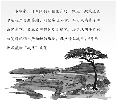 日本政府的第一项措施是决定废除实施了5年的限制水稻生产的“减反”政策,同时停止向农户发放补贴。日本过去水稻种植面积很大,但由于产量过多,造成大米价格下跌并影响了农户的积极性。“减反”政策就是政府提出限制水稻生产面积,以降低产量维持大米的高位价格。对于配合政府限制措施放弃水稻生产的农户,按面积发放补贴。多年来,这项政策造成水稻生产日趋萎缩,财政负担加重,而大米消费量却每况愈下。有关专家认为,“减反”政策实际是扼杀农业生产的政策,强烈呼吁废除这项政策。日本政府经过反复研究,决定从明年开始放宽对水稻生产面积的限制,农户补贴减半,5年后彻底废除“减反”政策。