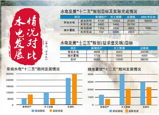据水电水利规划设计总院院长郑声安介绍,“十二五”期间,我国常规水电新开工5800万千瓦,为规划目标的48%;抽水蓄能新开工2090万千瓦,仅为规划目标的52%;抽水蓄能新增投产732万千瓦,也只有规划目标的55%。三者均“打了五折”。