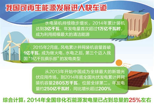 自2005年我国通过《可再生能源法》后,可再生能源正式进入规模化发展快车道。近年来,我国水电装机持续稳步增长,2014年累计装机达到3亿千瓦,年发电量首次超过了1万亿千瓦时,成为利用规模最大的清洁能源。作为中国水电的标志性工程,三峡水电站2014年全年发电量达到了988亿千瓦时,创单座水电站年发电量的世界最高纪录,累计发电量突破8000亿千瓦时,相当于累计为社会节约原煤消耗4亿吨,减少二氧化碳排放8亿吨,减少二氧化硫排放800多万吨。