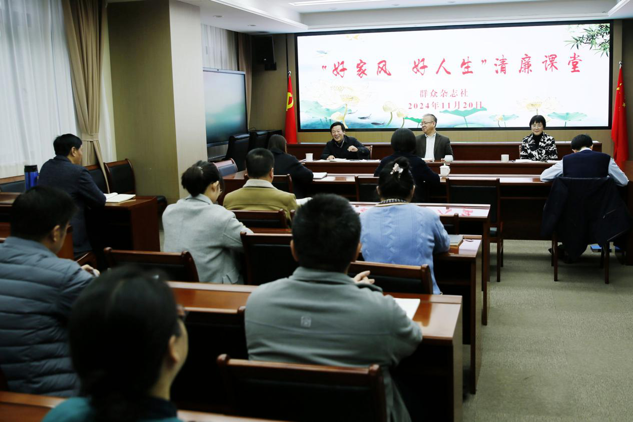 为深入贯彻落实习近平总书记关于家庭家教家风建设的重要论述,激发家庭力量,弘扬清风正气,2024年11月20日,群众杂志社举办“好家风 好人生”清廉课堂,引导机关党员修身律己、廉洁齐家的思想自觉、行动自觉。总编辑周斌、副总编辑曹巧兰和各处室机党员干部及部分干部家属参加活动,副总编辑、机关党委书记李克海主持会议。