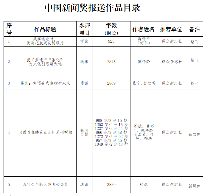 根据中国期刊协会《关于开展第35届中国新闻奖新闻期刊作品初评工作的通知》要求,群众杂志社拟推荐5件作品参加第35届中国新闻奖评选,现予以公示。公示期为3月27日至4月2日,共5个工作日。如有异议,请于4月2日17时前向群众杂志社总编办反映。