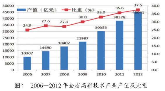 高新技术产业产值屡创新高。2006年,全省以航空航天制造业、电子计算机及办公设备制造业、电子及通信设备制造业等为代表的高新技术产业产值突破1万亿元,2012年超过4万亿元;2006—2012年,高新技术产业产值年均增长28.2%(现价),超出同期规模以上工业总产值增速7.5个百分点;2012年高新技术产业产值占规模以上工业总产值比重已超过1/3,达37.5%,比2005、2010年分别提高12.9个和4.5个百分点。