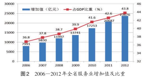 服务业规模扩大、比重上升。全省服务业增加值从2005年的6683.5亿元增加到2012年的23676亿元,年均增长13.2%,高出同期地区生产总值增速0.5个百分点;占GDP比重从35.9%提高至43.8%,年均提高1.13个百分点。服务业税收对全省税收的贡献明显提高。2012年,全省实现服务业税收总额3934.8亿元,占全省国地税税收总额的45.2%,比2005年提高22.7个百分点;服务业税收对税收总额增量的贡献率达65.1%,比上年提高10.7个百分点。服务业成为吸纳社会就业的主渠道。2012年,全省第三产业从业人员达1737万人,与2005年相比年均增加39.5万人;占全部就业人员的比重为36.5%,提高4.6个百分点。