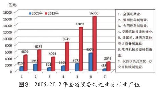 先进制造业加速成长、规模扩大。2012年,全省规模以上制造业实现产值114962亿元,占全国的1/7左右,与2005年相比年均增长20.7%。制造业主要行业实力增强,全省产值超万亿元的工业行业由“十五”末的机械1个行业,增加到机械、纺织、电子、冶金、轻工、石化6个行业,主要工业产品的生产能力大幅提高,产量在全国占有较大比重。