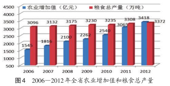 农业综合生产能力提高。2012年全省实现农业增加值3418亿元,居全国第三位,2005年以来年均增长4.3%。农业生产效率稳步提高,2012年全省农业从业人员创造的农业增加值达33963元,居全国首位。2006年以来,全省粮食总产量稳定在3000万吨以上,实现“九连增”,2012年达3372.5万吨,亩产达421.3公斤,总产量和亩产均居全国第四。“菜篮子”工程建设取得可喜成效,蔬菜产业成为江苏农业经济第一产业。2012年全省蔬菜总产量达4984.6万吨,总产值超过1000亿元。现代渔业、畜牧业、林业和农林牧渔服务业发展加快。