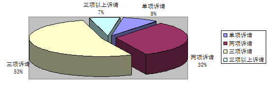 2. 诉请呈复合新型化发展趋势。大量劳动争议案件中,工资报酬、经济补偿金、加班费、社会保险等诸多诉求往往杂糅在单个诉讼中,法律关系复杂,审理工作量较大。以我庭2015上半年受理的206件二审劳动争议类案件为例,仅有单一诉讼请求的案件仅占收案总数的约8%,两项诉请的占32%,三项诉请的占53%,三项以上诉请的占7%。(见图三)同时,除追索劳动报酬、工伤保险待遇纠纷、经济补偿金纠纷等传统案件类型外,一些新类型的劳动争议案件也不断呈现,法律适用难度越来越大。比如由于“用工荒”的影响,一些艰苦工作岗位,企业只能就地招用一些临近退休的当地农民进厂务工,由此产生了这部分劳动者跨退休年龄后劳动关系的认定等疑难复杂问题,再如由于企业经营业态的多样,类似项目经理、包厨人员等非典型劳动关系的确认之诉等等。