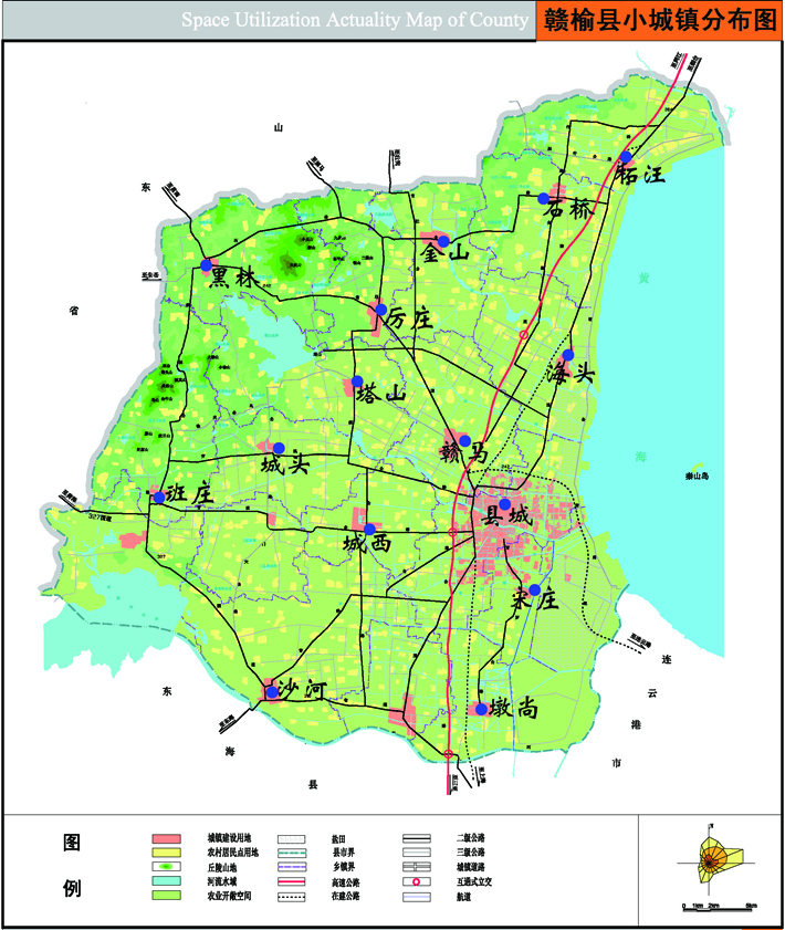 图1:赣榆区小城镇分布图(共15个镇东部沿海、中部平原、西部山区)