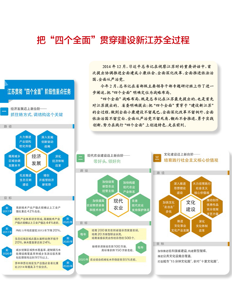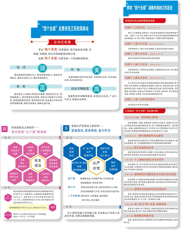 “四个全面”战略布局,既是总书记在江苏最先提出的,也是首先对江苏提出的。省委明确提出:把“四个全面”贯穿于“建设新江苏”的全过程,做到全面小康建设不留尾巴、全面深化改革不留例外、全面依法治国不留空白、全面从严治党不留死角,锲而不舍推进,勇于实践创新,努力在践行“四个全面”上创造特色、走在前列。