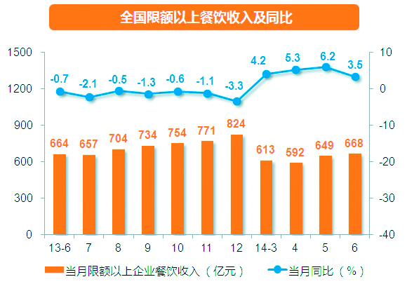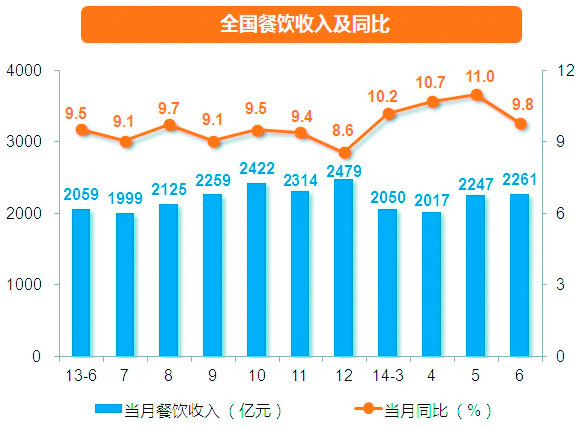 随着市场大环境的稳定及国家扶持政策的出台,经历了一年多的调整之后,中国的餐饮行业终于迎来新的发展。近日,中国烹饪协会发布的2014年上半年餐饮市场分析报告显示,今年1-6月份,全国餐饮收入12989亿元,同比增长10.1%。其中,6月份全国餐饮收入为2261亿元,比上年同期增长9.8%,增速维持高位。业内人士分析,虽然餐饮市场开始软着陆,企稳回升之势明显,但是,面临经营成本的增加、食品安全问题的频发,餐饮业正步入微利时代。中国的餐饮行业需要对市场需求变化的调整,进一步探索转型发展,以实现更长远的良性发展。