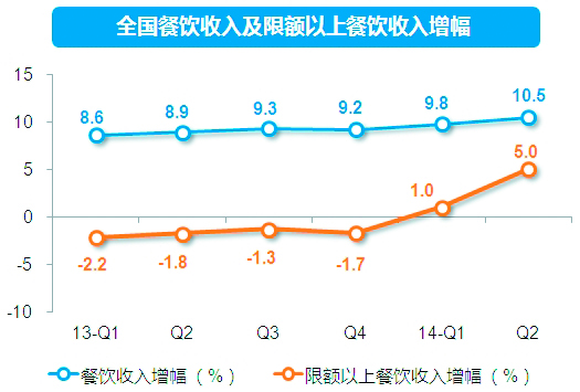 2013年,平稳发展30年的中国餐饮业进入“洗牌阶段”,经过一年多的调整转型,餐饮行业正逐渐从2013年的低迷状态中走出,特别是限额以上餐饮企业,正逐渐步入稳步回升的态势。国家统计局数据显示,分季度来看,相较一季度,餐饮行业在二季度增长明显加快,增速重新回至两位数。并且,餐饮收入增幅与社会消费品零售总额增幅的差距也在逐渐缩小,由一季度的2.2个百分点降至2.0个百分点。