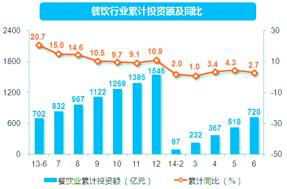 纵有行业数据向好和政策支持两大利好,餐饮行业的整体发展还是面临着不少难点。由于近两年来整个行业的走低,餐饮行业的固定资产投资呈现持续下降趋势,最新数据显示,2014年1-6月,餐饮行业固定资产投资累计额为720亿元,累计同比仅为2.7%,而在上年同期,这一数据高达20.7%。极大的数据落差反应了业内对餐饮业前景的不看好,导致投资增速急速回落。