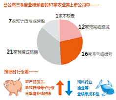 数据显示,已公布三季度预报的57家农业类上市公司中,业绩预增或略增的有21家,扭亏或续盈有7家,占比超五成。其中,大康牧业预计净利润同比大增6893.8%居首,罗牛山预增1130.27%紧随其后,朗源股份、晨光生物、中水渔业分别预增630%、499.08%和295%。此外,圣农发展等6家上市公司业绩预增超100%,10家上市公司预增超50%。从畜禽养殖行业来看,禽苗价格数据显示,三季度均价明显高于第二季度,表明禽类养殖公司的三季报表现靓丽是大概率事件。15家畜禽养殖上市公司中,12家已公布三季报业绩预告,8家业绩预增,大康牧业、罗牛山均同比大增。*ST民和、圣农发展、华英农业等业绩预增超100%。农业上市公司中业绩预减或略减的有12家,首亏或续亏有16家,占比近五成。其中,新五丰、正邦科技首次出现亏损,预计净利润大幅下滑965.35%和917.27%。东凌粮油、雏鹰农牧、神农大丰、牧原股份等均出现首亏,业绩降幅均超100%。从细分行业来看,农产品加工、畜牧养殖等子行业三季度业绩好转,饲料行业、渔业等业绩表现不佳。(图3)