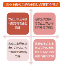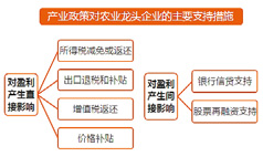 产业政策对农业的支持一方面体现在直接对农民的种粮补贴和农村社会保障上,另一方面则在现代农业的发展上,这一点是直接影响农业类上市公司的政策因素。现代农业发展的一个基本特点是:直接从事农业生产的部门,无论是在规模上还是在产值上都越来越小,而从事农用物资供应的产前部门和从事农产品运销加工业务的产后部门则越来越大。农业风险的承担分布是这样:农户承担生产过程中的自然风险,中介组织和龙头企业则承担市场风险。农业产业化的目的便是利用利益机制将这些主体联系在一起,实现农业的跨越发展。其中农业龙头企业在分工合作收益和交易费用节约方面具有组织优势。