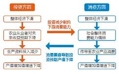 近期公布的多项数据均显示国内经济下行压力较大,导致整体市场需求不足。宏观经济的下行趋势对农业的影响主要体现在投资和消费两方面。在投资方面,由于整体经济的下滑导致农业从业者对未来收益预期下降,从而导致生产资料投入减少,农业投资的减少进一步导致产值增加值增速的下降。在消费方面,宏观经济的下行趋势导致社会整体消费能力偏弱,终端消费能力的下降传导至农业产业链的下游,农业产品消费能力进一步下降也会导致产值增加值增速的下降。投资和消费之间也存在彼此影响的关系,消费的萎靡导致投资预期产值下降,投资的减少也制约下游消费能力。(图1)