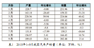 2015上半年,我国汽车产销分别完成1209.71万辆和1185.49万辆,比上年同期分别增长2.6%和1.4%。前三季度,汽车产销1709.16万辆和1705.65万辆,比上年同期分别增长–0.82%和0.31%。其中,4–7月汽车产销环比和同比双双下降。9月,汽车产销分别完成189.43万辆和202.48万辆,环比分别增长20.6%和21.6%,与上年同期相比产量下降5.6%,销量结束连续5个月的同比下跌,增长2.1%,表明我国汽车行业有回暖迹象,但总体形势仍然不容乐观。