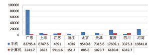 图4 2015年中国部分省市手机、电脑产量(万部)