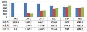 图3 2010-2015年江苏、重庆、四川电脑生产量(万台)