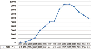 在电子消费品中的个人计算机领域,江苏是外资企业尤其台湾企业“扎堆”区域。由于外资电子信息制造企业登陆江苏的高峰期(即2005年到2011年),正处于电子信息产业笔记本电脑替代台式电脑高峰期,因此,外资企业在江苏选择以布局笔记本电脑制造基地为主。江苏电脑生产量经历了由低到高、再从高到低的过程,有两个方面的原因。一方面,因全球智能手机时代到来,消费电子产品市场需求热点已由笔记本电脑转移到了携带更为方便且具有笔记本电脑上网、玩游戏、发送信息等相同功能的智能手机。2011年江苏电脑产量达到历史最高峰9408.2万台后,一直处于下降过程中。另一方面,2011年重庆、四川成为笔记本电脑生产基地后,分流了江苏电脑相当部分市场份额,尤其渝新欧定期快速班列的开通,欧洲电脑市场需求大部分转移到由重庆、四川提供,江苏电脑产量被四川、重庆超过。