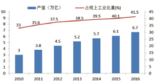 图 2010-2016年江苏高新技术产业产值及占规上工业比重