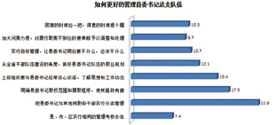 针对管理过程中的这些问题,受访县委书记也提出了个人见解。比如,把县委书记与其他同职级干部实行分类管理(占22.8%);明确县委书记职权范围和履职程序,使其施政有据(占17.6%);上级组织要与县委书记经常谈心谈话,了解思想和工作动态(占15.4%);从全省干部队伍建设的角度,做好县委书记队伍的职业规划(占12.1%);实行目标管理,让县委书记明白要干什么,应该干什么(占10.7%);困难的时候拉一把,得意的时候提个醒(占10.3%)等被看作是应该重点抓好的举措。