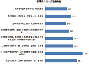 与严格管理相呼应的是形成有效激励。对此,鼓励干满任期,无特殊原因任期内一般不要调动(占22.1%);对于任期内特别优秀的,可以在现职务的基础上优先高配职级(占25.9%);实行职务职级并行,到一定年限的,享受高一级待遇(占19.3%);在涉及重大项目、县区党政班子成员配备和总体工作部署等方面,多听取县委书记意见建议(占19.4%);强化理想信念教育,增强当好县委书记的责任感和使命感(占16.3%);多给县委书记自主权,鼓励放手大胆干(占14.3%);遇到困难时,组织多给一些鼓励、多一份理解(占17.9%);表彰宣传优秀县委书记及其先进事迹(占14.9%),被大多数县委书记看作是重点。