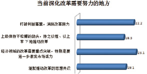 发展的过程也是推动改革的过程。50.4%的受访县委书记对改革持积极态度,认为“改革的整体趋向是明朗的,前景是光明的”,也有30.2%的受访县委书记深刻地意识到“改革正处于胶着状态,依然面临一些阻力”。为此,需要从凝聚思想共识(占19.1%)、进一步激发市场活力(占23.1%)、打破利益藩篱(占22.2%)、保持持之以恒的劲头(占18.3%)等方面推进改革。