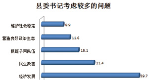 能不能抓好县域治理是检验县委书记工作绩效的主要指标,也是影响其思想状态的重要因素。因此,县委书记在日常工作中,所思所想所干都紧扣县域治理。县域治理工作千头万绪,但县委书记考虑较多的问题还是主要集中在经济发展(占39.7%)、民生改善(占21.4%)、抓班子带队伍(占15.1%)、营造良好政治生态(占11.6%)、维护社会稳定(占8.9%)。