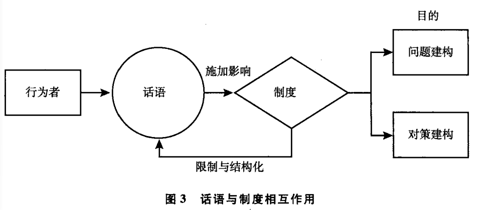 学者哈杰尔提出从话语分析的视角来解读政策网络。他认为,“话语”可被视为“想法、概念和分类的特定全集”,在政策过程中,它是理解世界的一种共享的方式,它包含了规则,并通过其促使或限制社会行动。因此,基于共同的术语和概念来建构政策问题,使得“行为者努力获得话语霸权,并以此来保护其对现实的特定界定”。同时,制度对话语也具有限制、规范和解释的效力。