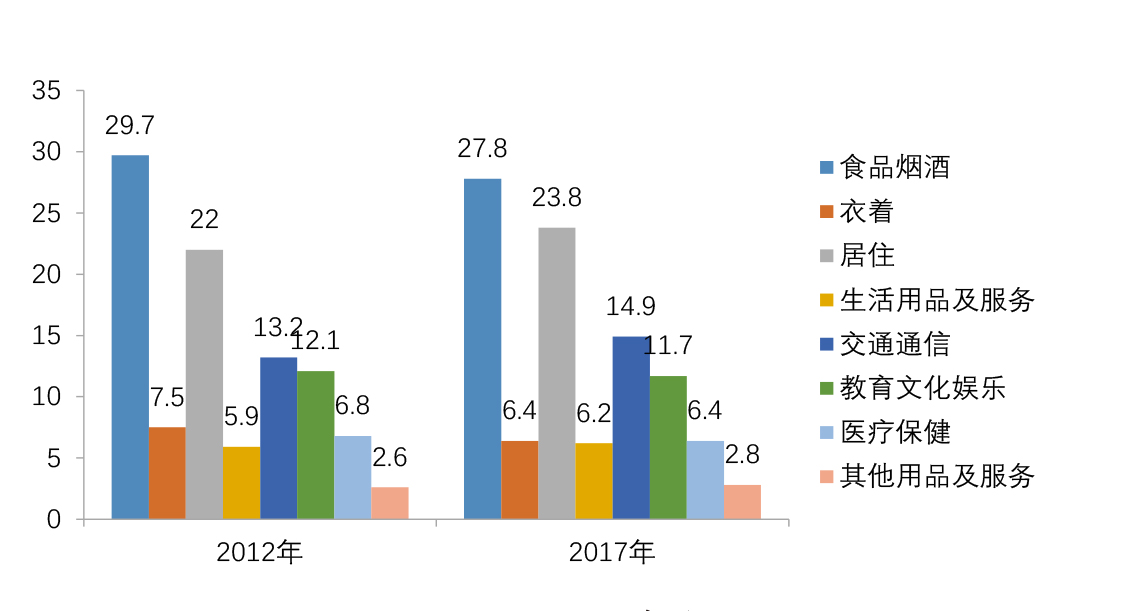 2012、2017年江苏居民消费支出结构(%)