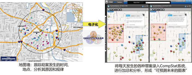 上世纪70年代起,纽约市黑帮横行、毒品泛滥,治安状况不断恶化。90年代中期,纽约警察局开发了一个以地图为基础的统计分析系统--CompStat(见图2),治安开始逐年好转,应用第一年凶杀案就减少24%,到2009年凶杀案更是大幅减少。这一系统原理非常简单,通过将每天发生的罪案数据录入到系统中,分析出在什么时间什么地点最容易发生什么样的案件,以便及时部署警力予以应对,效果十分明显。CompStat系统正是使用预测这种数据分析方法,根据现有数据预测未来可能发生的事件,提前做好预案。