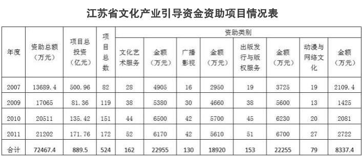 2007年,江苏省政府设立了初始规模为1亿元的文化产业引导资金,并于2009年增加到2亿元。经过2007—2008、2009、2010、2011四个年度的申报评审工作,共资助了524个文化产业项目,资金总额为7.24亿元。按项目性质分,文化艺术服务项目162个,22955万元;广播影视项目130个,18920万元;出版发行与版权服务项目153个,22255万元;动漫与网络文化项目79个,8337万元。带动项目总投资额超过800亿元,有效发挥了财政资金“四两拨千斤”的作用(详见下表)。