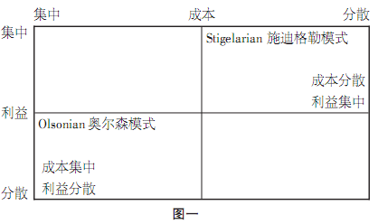 该图是美国著名公共管理学者詹姆斯·威尔逊提出的有关公共政策利益的成本-收益分散图,图中显示两种涉及公共利益分布的典型状态,一种是成本集中而利益分散,另一种是成本分散而利益集中。作为决策结果,这两种状态都是不理想的,理想的状态应该是成本和利益的均衡,不均衡就会带来“搭便车”和“寻租”的政策漏洞。