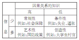 图中所示,是公共政策学中有关政策方案类型的知识。任何政策方案都会涉及与政策相关因果知识和信息依赖这些因素,根据两个因素的具体状况形成的政策方案就有图中所示的常规性、条件性、创造性和艺术性四种。政策规划的不同类型,要求在备选方案挑选即决策时注重不同的评估重点。常规性政策规划方案因因果关系较容易把握,所需的信息较少,衡量其决策科学性的标准往往看其如何选择和确定实施方案;有些政策规划方案既没有明确的因果关系,依赖的信息量又大,其决策就不能照搬照抄,对创造性能力要求较高,因此如无创造力则无法做出相应的决策。条件性和艺术性这两类政策规划方案类型,也表明了其决策所需要的决策者的知识结构和特质。决策者将会面对什么政策规划类型进行决策,这是事前不知道的,但如果公共管理的决策者具有相关的知识,则可以帮助其做出相应的正确决策,从而避免盲目性。
