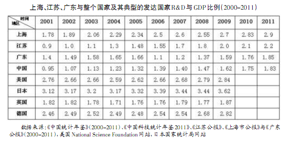 值得分析的是东部发达地区的研究与试验发展(R&D)的经费投入情况。研究与试验发展(R&D)是指在科学技术领域,为增加知识总量以及运用这些知识去创造新的应用而进行的系统的、创造性的活动,包括基础研究、应用研究、试验发展三类活动。从2000-2011年,上海、江苏与广东等地区R&D投入占GDP比值快速增长,处于全国前列。2011年,江苏高新技术产业产值达到3.8万亿元,人才贡献率33.5%,科技进步贡献率55.2%,区域创新能力连续3年位居全国第一,走出了以人才优先发展引领科学发展的新路子。□