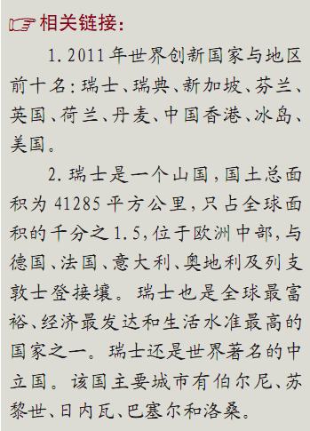 瑞士,曾是个贫穷落后的农牧业小国,国土面积仅有4.1万平方公里,人口不足1000万。如今却在纺织、机械制造、仪器仪表、医药、金融等十多个行业中占据世界领先地位,产生了雀巢、辉瑞制药、瑞士银行等世界知名500强企业。世界知识产权组织(WIPO)发布的“2012年全球创新指数”(GII)报告显示,瑞士已连续两年被评为世界第一。