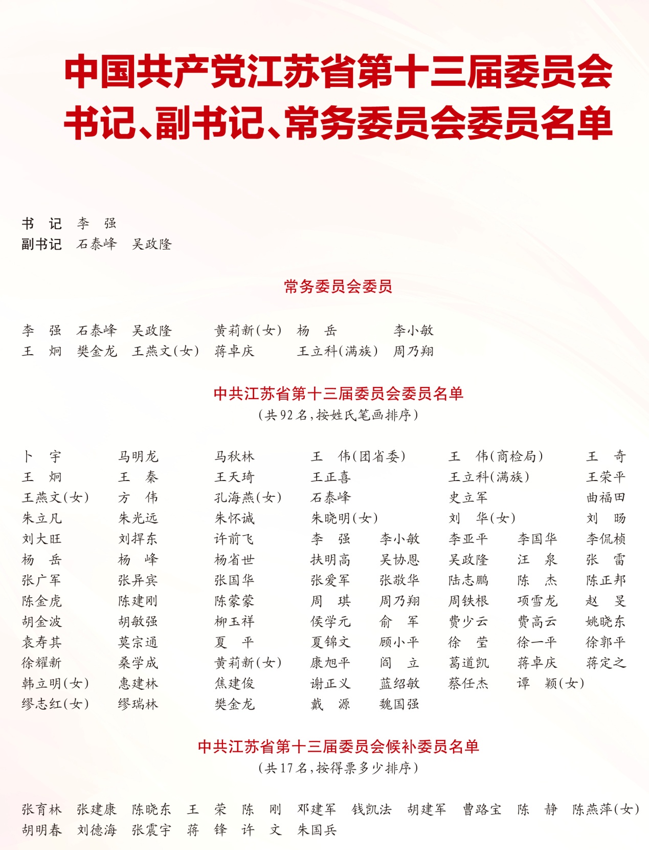 中国共产党江苏省第十三届委员会书记、副书记、常务委员会委员名单